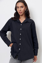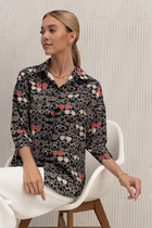 Блузка женская свободного силуэта из ткани. Блузка с цельнокроеной планкой и центральной застежкой на пуговицы. На левой детали переда накладной карман.