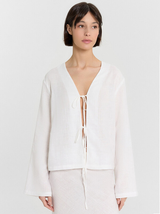 Блузка прямого силуэта. Горловина V-образной формы. Центральная застежка на завязки. Борта обработаны подбортами. Рукава втачные длинные, свободные. Плечо спущено. Нижний срез блузки и рукавов обработан швом вподгибку.
