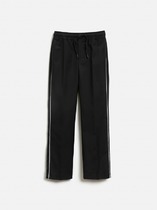 Брюки прямого силуэта. Посадка средняя. Пояс отрезной, внутрь застрочена  эластичная тесьма и шнур. По поясу две декоративные строчки. На передних деталях накладные карманы с наклонным входом. Ложный гульфик. По низу изделия внутрь застрочена эластичная тесьма.