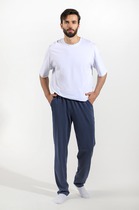 Брюки для дома, отдыха и спорта из трикотажного полотна. Облегание свободное, длина классическая. Штанины на манжетах. Внутренние карманы на подкладке. Широкий пояс с эластичной тесьмой и регулировочным шнуром. Комфортная модель!