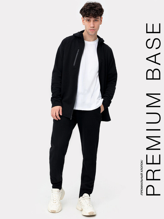 Брюки из трикотажного полотна "интерлок" с боковыми карманами на молнии. Силуэт слегка зауженный к низу. Пояс с эластичной тесьмой внутри и манжеты выполнены из основного материала.