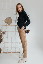 Брюки прилегающего силуэта из экокожи. Длинна классическая. Линия талии значительно завышенная. Вытачки на задней части формируют современный крой. На уровне колена – вертикальный шов. Пояс на жаккардовой эластичной резинке. Хит продаж