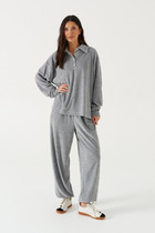 Брюки прямые свободные. Посадка средняя. Пояс цельнокроеный с эластичной тесьмой внутри. С внешней стороны пояса пробиты петли и втянут шнур. В боковых швах обработаны карманы. Подкладка карман из основного полотна. Нижние срезы обработаны швом вподгибку.
