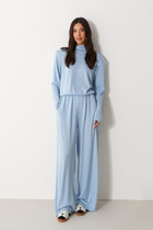 Брюки прямого силуэта зауженные к низу. Пояс отрезной. Задняя часть пояса присборена на эластичную тесьму. По поясу настрочены шлевки. На деталях переда обработана имитация карманов. На правой передней половинке отстрочена декоративная строчка - имитация гульфика. В боковом шве застежка на потайную молнию. На задних половинках в районе колен декоративные горизонтальные подрезы. Нижние срезы брюк обработаны швом вподгибку на 2х игольной плоскошовной машине.
