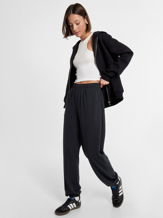 пояса пробиты петли и втянут шнур с застроченными концами. В боковых швах обработаны карманы. Подзор для карманов из основного полотна, подкладка из кулирки. По низу отрезные манжеты из основного полотна.