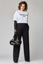 Брюки женские прямого силуэта из ткани. На деталях переда карманы с отрезным бочком. Пояс отрезной состоит из двух частей, задняя часть пояса присборена на резинку. Посадка средняя.
