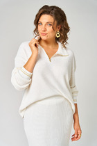 Джемпер женский прямого силуэта из трикотажного полотна кулирка. Горловина круглой формы, широкая обтачка из рибаны. Рукав втачной, длинный. Подгибки низа и рукава широкие.