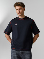 Футболка свободного силуэта. Перед и спинка цельнокроеные. Горловина круглой формы. Обтачка горловины из рибаны 1*1. По горловине проложена отделочная строчка. Горловина спинки закрыта тесьмой из основного полотна. Плечо спущено, пройма углублена. Рукав втачной, длина рукава чуть выше локтя.