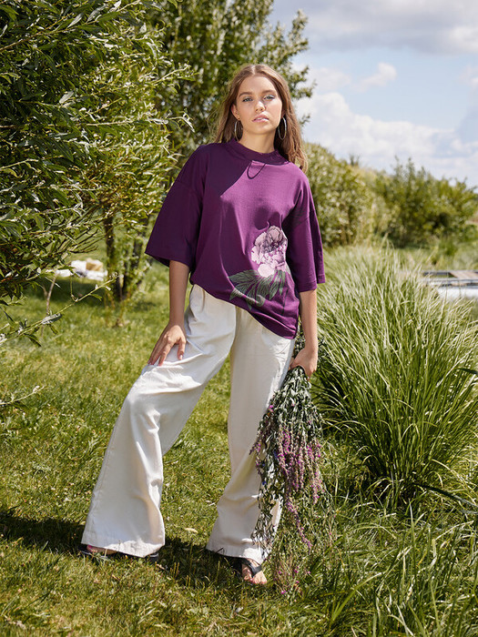 Футболка женская свободного силуэта из трикотажного кулирного пототна. Горловина круглой формы, с широкой обтачкой из рибаны. Плечо спущено, пройма углублена. Рукав втачной, длиной по локоть. Подгибка низа и рукавов широкая.