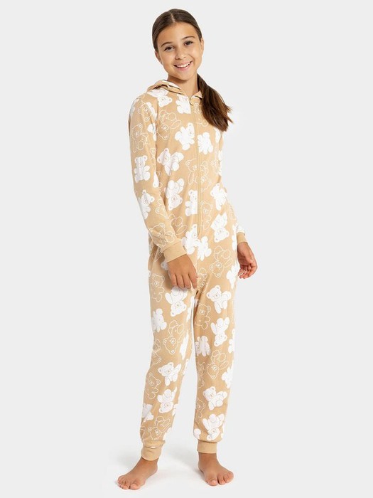 Комбинезон из трикотажного полотна интерлок. Силуэт свободный, на капюшоне – декоративные ушки из искусственного меха. Застегивается на центральную молнию. Рукава длинные, на манжетах из рибаны, как и штанины. Такой конфортный и очаровательный комбинезон, что ваша девочка не захочет его снимать!