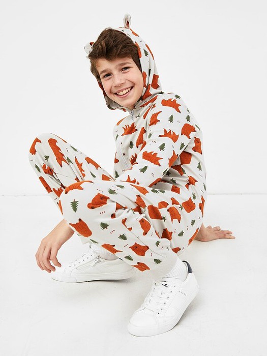 Детский комбинезон из трикотажного интерлока. Комфортный свободный силуэт, уютный капюшон с декоративными ушками из мехового полотна, удобная застежка-молния по центру. Длинные рукава завершаются широкими манжетами, как и штанины. Универсальный домашний комбинезон!