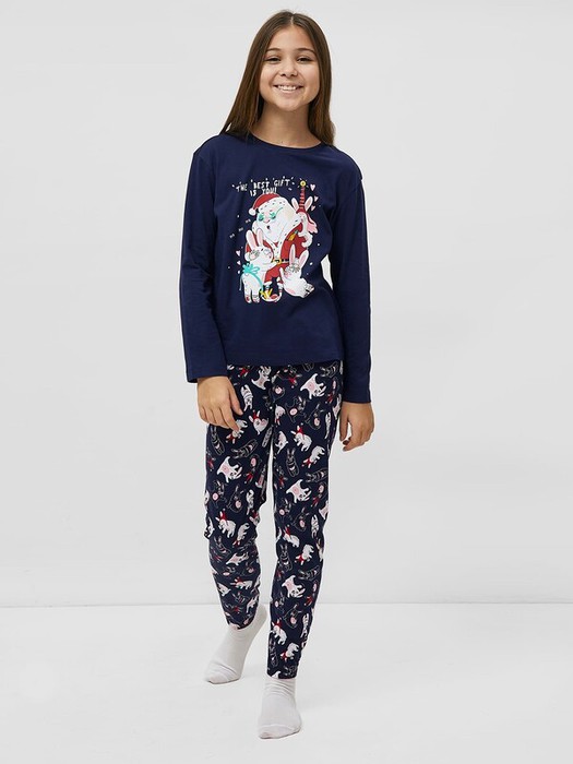 Уютная хлопковая пижама для вашей девочки. Выполнена из трикотажной кулирки. Состоит из классического лонгслива и слегка науженных к низу брюк. Горловина круглая, рукава короткие, низ штанин на резиновой тесьме. Отличный выбор!