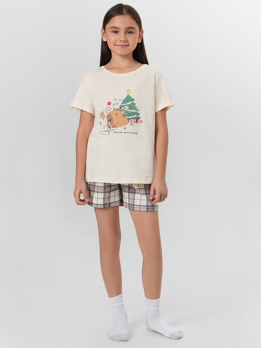 Комплект для девочки, состоит из футболки с короткими рукавами и шорт из натурального хлопка. Подходит для сна и отдыха. Материал очень приятный к телу, хорошо пропускает воздух, что позволяет чувствовать себя комфортно даже в жаркую погоду. Идеальный выбор детской одежды для дома. Стильно, красиво, комфортно. Футболка декорирована интересным принтом, шортики однотонные. Широкий размерный ряд, базовые и яркие расцветки, модели с принтами, рисунками и печатями. Купите детскую пижаму для девочки от Mark Formelle, порадуйте ребенка красивым и стильным подарком!