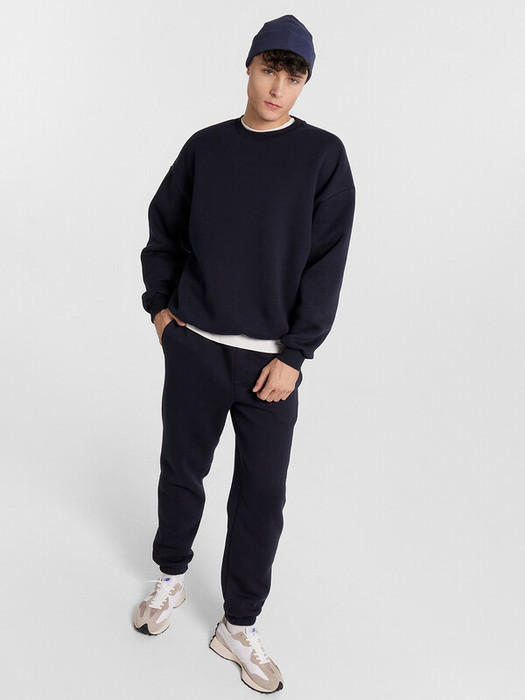 Свитшот свободного силуэта, оверсайз. Горловина округлой формы, обработана обтачкой из рибаны. Шов втачивания обтачки по спинке закрыт бейкой из кулирки. Рукава втачные длинные, с отрезными манжетами из рибаны. Линия плеча спущена. По низу отрезной пояс из рибаны. Брюки прямые, зауженные к низу. Пояс отрезной с эластичной тесьмой внутри. С внутренней стороны пояса пробиты петли и втянут шнур. В боковых швах обработаны карманы, подкладка карман из кулирки. На левой передней половинке проложена декоративная строчка - имитация гульфика. Нижние срезы брюк обработаны швом вподгибку с эластичной тесьмой внутри.