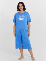 Комплект женский состоит из блузы и брюк. Блуза на тонких бретелях прямая, свободная. Бретели с регулировкой на регуляторы и кольца (пластик 6мм). Верхний срез обработан обтачкой из основного полотна. На передних половинках застрочены вытачки. По переду застежка на завязки.