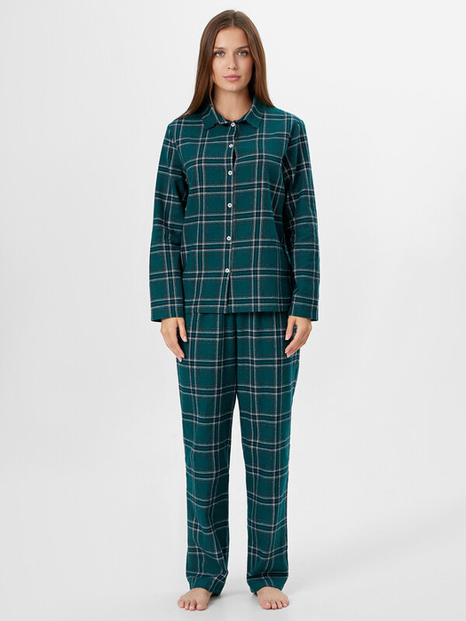 Пижама женская домашняя в клетку — это уют и гармония для вашего отдыха. Набор из рубашки и брюк выполнен из хлопка, который дарит коже нежность, воздух и комфорт. Свободный силуэт рубашки с заниженной линией плеч и длинными рукавами не сковывает движений, а застежка на пуговицы добавляет классическую элегантность.