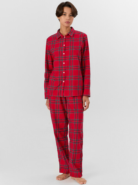 Брюки с широким эластичным поясом мягко сидят на талии, не оставляя следов, а клетчатый рисунок придает образу теплоту и домашний шарм. Этот комплект подойдет для сна, утреннего кофе или отдыха с книгой — он сочетает практичность и стиль.