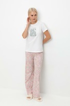 Брюки прямого кроя со средней посадкой удобно сидят на фигуре благодаря широкому поясу с эластичной тесьмой. Все срезы изделий тщательно обработаны, что подчеркивает внимание к качеству исполнения. Мягкий хлопковый материал с добавлением эластана нежно облегает тело, позволяя коже дышать, и сохраняет форму даже после стирок. Этот комплект станет воплощением домашнего уюта, где каждая деталь продумана для вашего расслабления и прекрасного самочувствия.