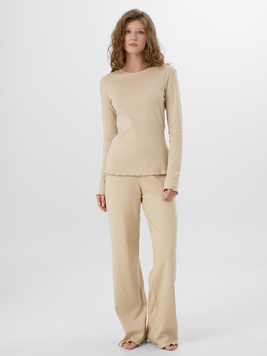 Джемпер свободного силуэта, чуть приталенный. Перед и  спинка цельнокроеные. Горловина овальной формы, обработана в подгибку. Рукава втачные, длинные. Низ изделия  и рукавов обработаны на микрооверлоке. Брюки свободного силуэта, с посадкой на талии. Пояс цельнокроеный с эластичной тесьмой внутри (внутр. 20мм 20 RV). Низ брюк обработан на микрооверлоке.