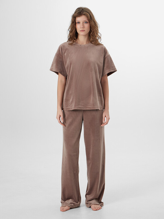 Джемпер прямого кроя с круглой горловиной и короткими рукавами не сковывает движения, а аккуратная обработка швов гарантирует комфорт. Брюки с высокой посадкой и широким эластичным поясом мягко фиксируются на талии, а практичные карманы-«хулиганы» добавляют функциональности.