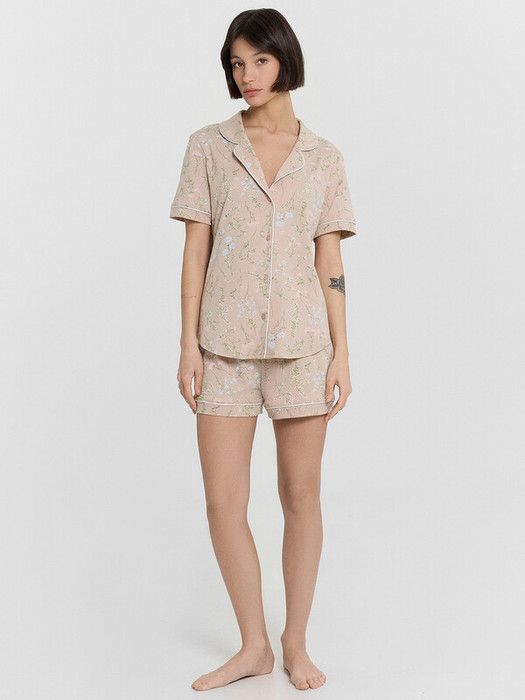 Хлопковый женский комплект актуального свободного силуэта. Рубашка прямая, с отложным воротником и лацканами, короткими рукавами, застегивается на пуговицы. Дополняют ее свободные шорты длины мини, с резиновой тесьмой в поясе и атласной тесьмой, которая завязывается на бантик. Особенность модели – контрастные канты на рукавах, воротнике и  передней части рубашки. Рекомендуем для сна, отдыха и домашних дел!