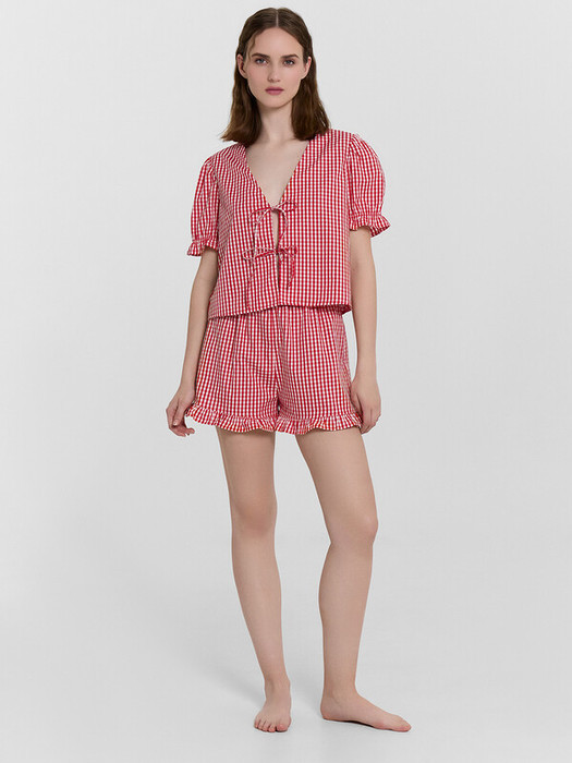 Позвольте себе уют и женственность с этим нежным домашним комплектом! Он создан для тех, кто ценит комфорт, элегантность и легкость даже в повседневных моментах. Жакет свободного силуэта с V-образной горловиной придает образу утонченность, а центральная застежка на завязках добавляет изящности и мягкости линиям. Короткие рукава-фонарики с резинкой создают романтическое настроение, даря ощущение воздушности и нежности. Аккуратная обработка низа жакета и рукавов вподгибку делает модель стильной и гармоничной. Свободные укороченные шорты с эластичной тесьмой на поясе обеспечивают удобную посадку, подстраиваясь под движения. Очаровательные рюши по низу добавляют легкости и игривости, подчеркивая женственный стиль. Изготовленный из натурального хлопка, комплект дарит ощущение мягкости и заботы, позволяя коже дышать и наслаждаться комфортом весь день. Этот комплект станет идеальным выбором для уютных вечеров и расслабленных утренних моментов, позволяя вам чувствовать себя уверенно и комфортно. Добавьте нотку нежности в свой домашний гардероб!
