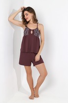 Эта красивая женская пижама свободного силуэта, выполненная из высококачественного хлопка, подарит вам комфорт на весь день и всю ночь. Горловина рубашки оформлена отложным воротником с лацканами, по краю которого проходит атласный кант, добавляющий изысканности и элегантности. Короткие рукава делают рубашку идеальной для теплой погоды, а центральная застежка на пуговицах обеспечивает удобство и стиль. Шорты свободного силуэта, декорированные рюшами по низу, добавляют образу очарования и женственности. Хлопковый материал обеспечивает легкость и приятные ощущения на коже, при этом пижама не жаркая, благодаря легкой и слегка тянущейся ткани, которая не сковывает движений. Эта модель подойдет как для сна, так и для домашних дел.
