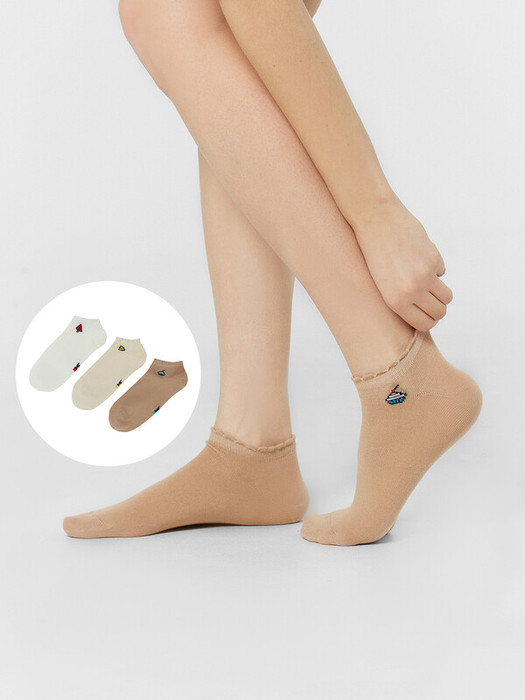рис.1982 Мультипак из трех пар женских носков укороченных c пикотом на борту и рисунками в виде пироженки, дольки лимона и арбузика.