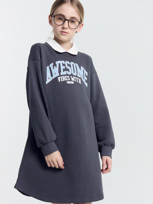 Платье свободного силуэта. Перед и спинка цельнокроеные. Горловина круглой формы c окантовкой из трикотажного полотна рибаны. В горловину втачан вязаный воротник, шов втачивания закрыт х/б тесьмой. Рукава длинные, втачные. Линия плеча спущена. По низу рукавов притачные манжеты из трикотажного полотна рибаны. Низ изделия фигурный, обработан на 2-х игольной
