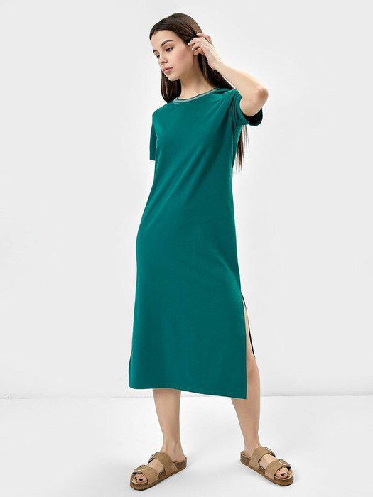 Платье свободного силуэта из футера. Платье имеет длину "миди" и удлиненную линию плеча. Изюминка модели – изящные боковые разрезы, которые очень популярны в текущем сезоне. Рукава короткие, вырез горловины круглый. Стильно!