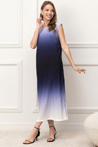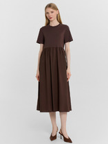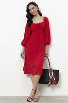 Платье полуприлегающего силуэта из ткани рошель. Горловина V-образной формы. Платье отрезное по талии, с эластичной тесьмой внутри. По эластичной тесьме проложены отделочные строчки. По детали переда средний шов. Детали спинки со средним швом. Рукав втачной, длинный. По окату слегка присборен. Длина рукава 3\4, по низу рукава настрочена эластичная тесьма которая делает сборку. Низ платья расширяется к низу. Длина платья ниже колена.