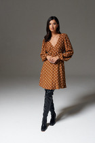 в чистый край. Горловина спинки более вырезана. Рукав втачной длинный, к низу рукав расширяется. Платье длиной выше колена.