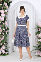 Платье женское прямого силуэта из трикотажного полотна селаник. Горловина круглой формы, с притачным воротником с отрезной стойкой из поплина и застежкой на пуговицу. Плечо слегка спущено, пройма углублена. Рукав втачной, длинный, по низу с отрезной манжетой из селаника. Платье длиной чуть выше колена.