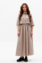 Спереди заложена складка и с декоративными пуговицами. Низ платья расширяется к низу.