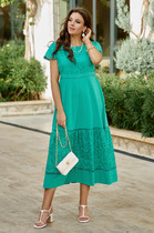 Платье А-силуэта. Горловина круглой формы с воротником стойкой. Плечо слегка спущено, рукав втачной, короткий. На детали переда вытачки. Спинка со средним швом и застежкой на потайную молнию. Нижний срез платья и рукавов обработан швом вподгибку на 2х игольной плоскошовной машине.