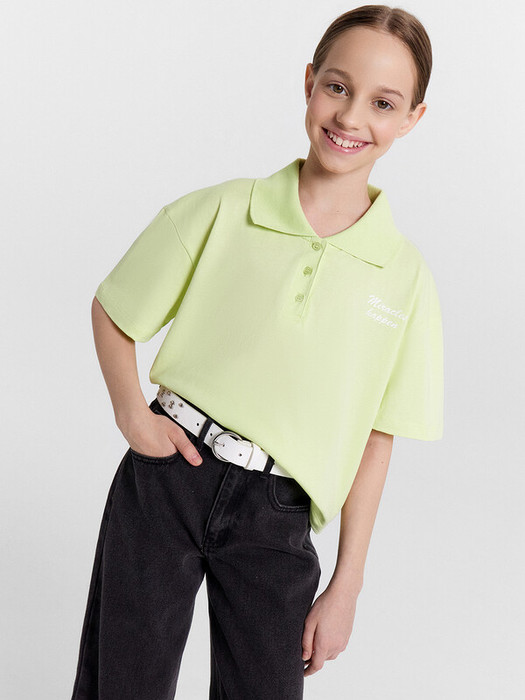 Поло для девочек свободного силуэта с воротником из довяза. На детали переда обработана планка с 3 пуговицами d=10mm, горловина круглой формы. Плечо спущено, пройма слегка углублена. Рукав втачной, короткий.