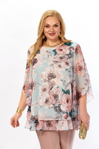 Рубашка свободного силуэта, с отложным воротником. Рукав втачной короткий, линия плеча немного спущена, рукав обработан вподгибку. Рубашка с центральной застежкой с петлями и пуговицами. Низ застрочен швом в подгибку.