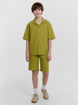 Шорты для девочек свободного силуэта из ткани. Посадка высокая. На детали переда карманы с отрезным бочком. Пояс отрезной с эластичной тесьмой RV40 внутри, на поясе пробиты петли и вставлен шнур из основного полотна. Шов втачивания пояса распошит. Длина выше колена. Низ обработан швом вподгибку с закрытым краем.