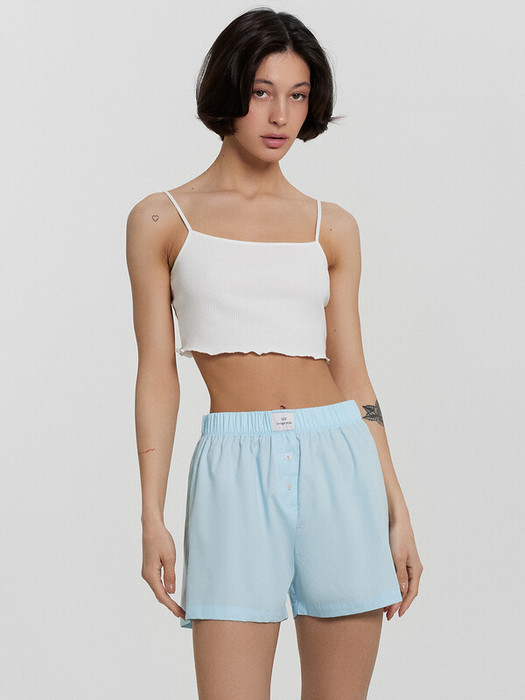 Шорты свободного силуэта. Пояс цельнокроеный, с эластичной тесьмой внутри. По правой, передней половинке обработана планка с имитацией застежки и с двумя пуговицами 10 мм . Нижние срезы обработаны швом вподгибку.