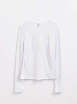 Свитшот прямого силуэта, свободный. Горловина круглой формы с обтачкой из рибаны. Рукава втачные длинные с отрезными манжетами из рибаны. Плечо спущено. По низу свитшота отрезной пояс из рибани и декоративная деталь из ткани имитирующая низ рубашки. Декоративная деталь по переду с застежкой на петли и пуговицы (на 4 прокола, d 10мм). Нижний срез фигурный.