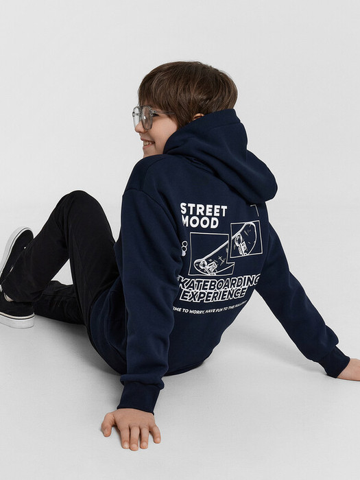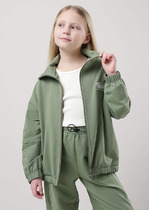 Жакет для мальчиков прямого силуэта с капюшоном. Капюшон на подкладке из основного полотна. Шов втачивания капюшона закрыт х/б тесьмой. Рукава втачные, линия плеча спущена. Притачные манжеты по низу рукавов и притачной пояс из рибаны. По переду застежка молния, карман кенгуру.
