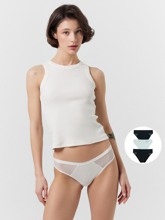 Трусы женские, средняя линия  талии, силуэт - липы. Передняя и задняя центральные детали выполнены из хлопка. Боковые детали из сетки (без боковых швов). Верхний срез трусов обработан жилкой. Нижние срезы трусов обработаны жилкой 6мм. Верхний срез подкладки ластовицы отлетной.
