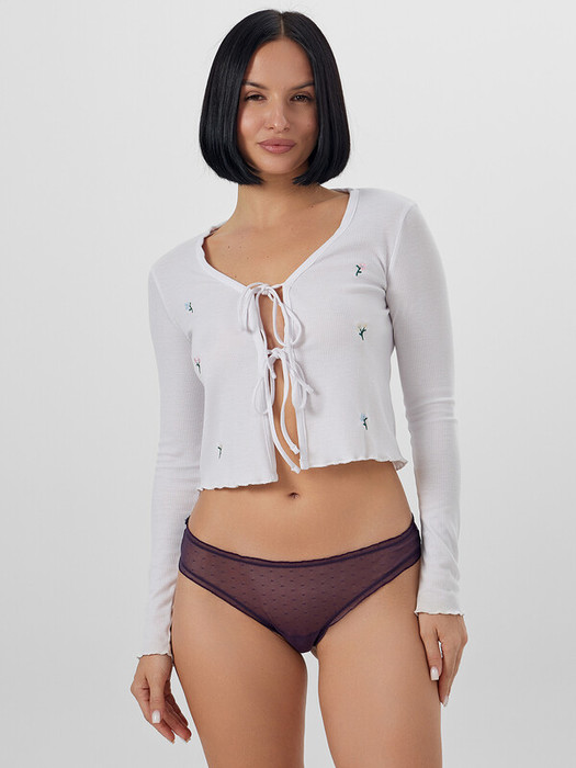 Трусы женские, средняя линия талии, силуэт - бразилиано. Передняя и задние детали выполнены из сетки. Подкладка ластовицы из хлопка, верхний срез подкладки ластовицы отлетной. По верхнему срезу трусов и по ножкам рюша из сборки, под низом жилка.