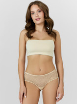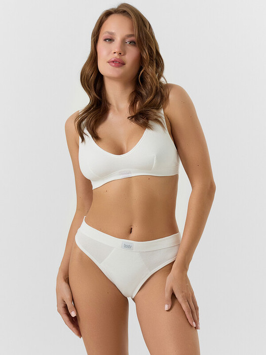 Трусы женские, средняя линия  талии, силуэт - бразилиано. Передняя и задняя детали выполнены из рибаны. Верхний срез трусов обработан бейкой поперечной из рибаны, внутри жилка 6мм. Нижние срезы обработаны бейками поперечными из рибаны. Подкладка ластовицы из хлопка, верхний срез ластовицы притачан к детали из рибаны (с изнаночной стороны имитация мужского гульфика, с лицевой стороны декоративные строчки).
