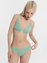 Передняя и задняя детали выполнены из микрофибры. Ластовица из кулирной глади отлетная по переднему срезу. По талии жилка тканая настрочена на п/ш с узким межигольным расстоянием.
