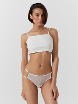 Передняя и задняя детали выполнены из микрофибры. Ластовица из кулирной глади отлетная по переднему срезу. По талии жилка тканая настрочена на п/ш с узким межигольным расстоянием.