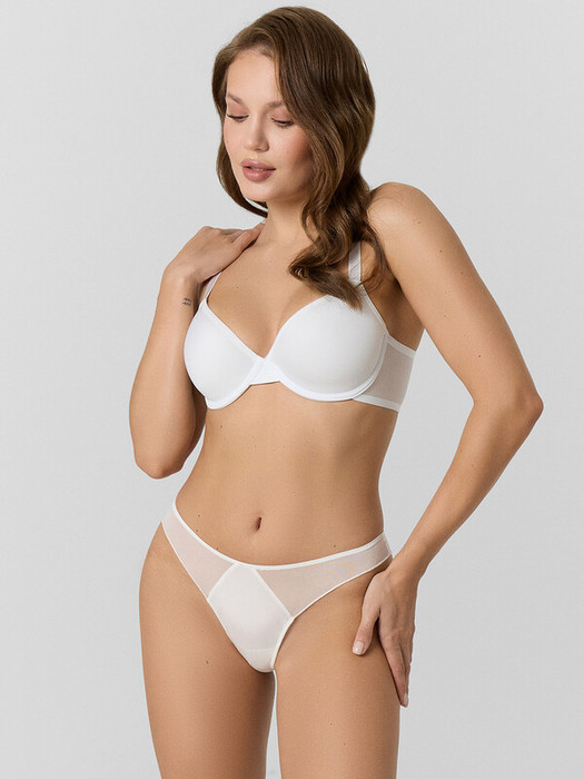 Трусы женские со средней посадкой силуэта «бразилиана». Передняя деталь с наклонными рельефами, центральная часть выполнена из микрофибры, а бочки- из эластичной сетки с флоком. Подкладка ластовицы из кулирного полотна отлетная по переднему краю. Нижние срезы по полотну обработаны в 2 приема эластичной тесьмой 6 мм (жилка тканая WT4-6).