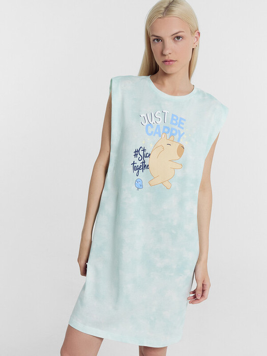 Туника изготовлена из кулирки. Туника  прямого силуэта. Перед и спинка цельнокроенные. Длина выше колена. Без рукавов, обработаны в подгибку. Горловина круглой формы, обтачка из основного полотна. Низ туники обработан в подгибку.