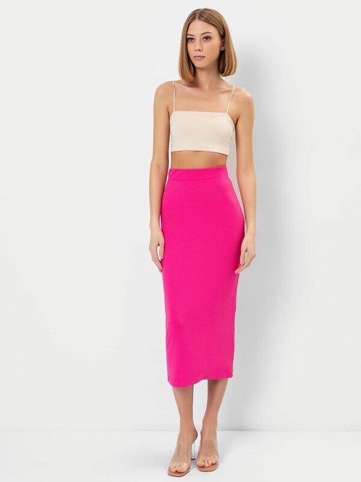 Яркая юбка женская прилегающего силуэта из трикотажного полотна рибана. Пояс отрезной из основного полотна с эластичной тесьмой внутри. Юбка длиной миди.