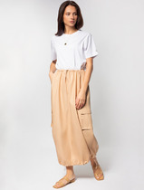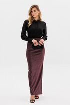 Юбка прямая, длина миди. Верхний срез обработан швом вподгибку с эластичной тесьмой внутри ( 40мм 40RV внутр.). На передней и задней детали проложена строчка по среднему шву. На задней детали в среднем шве обработан разрез. Нижний срез обработан швом вподгибку. Усилитель разреза- Лента репсовая шир.7мм, SFLR-2 .